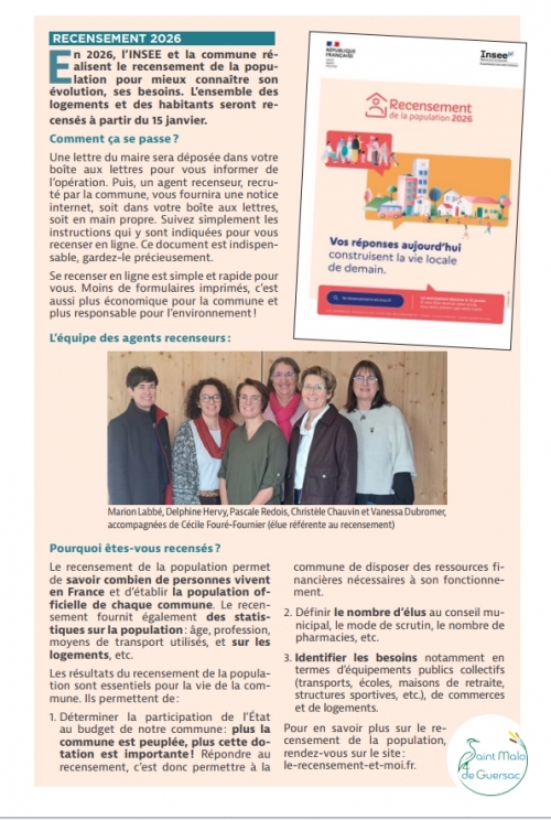 En 2026, l’INSEE et la commune réalisent le recensement de la population pour mieux connaître son évolution, ses besoins. L’ensemble des logements et des habitants seront recensés à partir du 15 janvier.