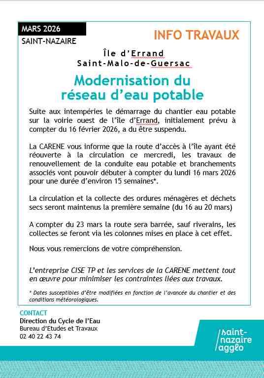 La CARENE vous informe que la route d’accès à l’île ayant été réouverte à la circulation ce mercredi, les travaux de renouvellement de la conduite eau potable et branchements associés vont pouvoir débuter à compter du lundi 16 mars 2026 pour une durée d’environ 15 semaines*.