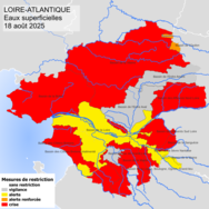 Les pluies éparses des derniers jours ne suffisent pas à améliorer l’état des ressources en eau et les fortes chaleurs ont continué de faire diminuer les débits des cours d'eau de la Loire-Atlantique. Par ailleurs, les prévisions météorologiques ne permettent toujours pas d'envisager une amélioration de la situation des cours d’eau à court terme, malgré les précipitations annoncées la semaine prochaine. Ces conditions entraînent la prise de nouvelles mesures de restrictions des usages de l’eau par le préfet, sur plusieurs zones de gestion superficielles, conformément à l'arrêté cadre sécheresse du 8 juin 2023 et l’arrêté cadre interdépartemental du 31 juillet 2023.